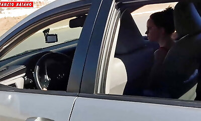 Aroused girlfriend stops her boyfriend's truck to blow him with force